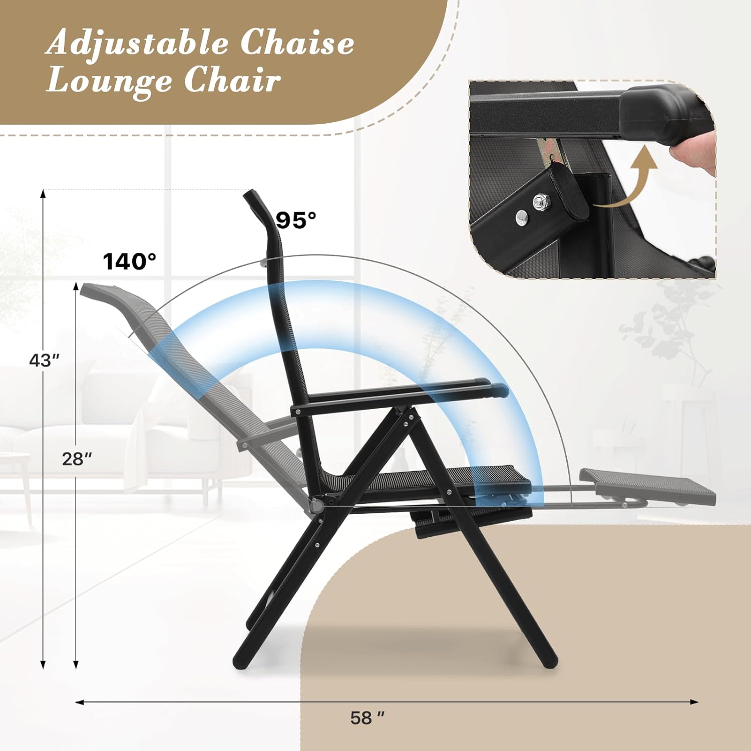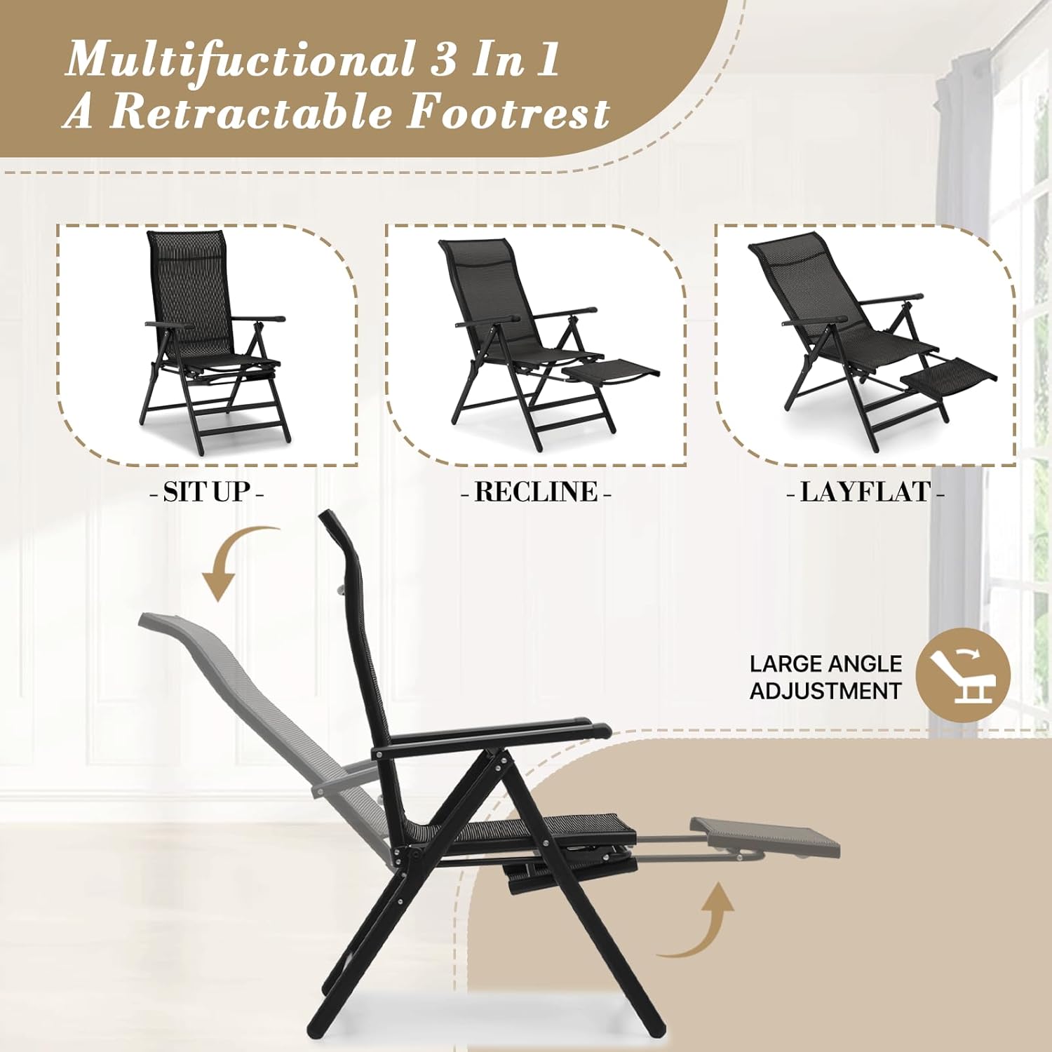 Athena Collection Patio Lounge Chair: Enjoy summer days in this sturdy patio chair, crafted from rust-proof alloy steel and breathable polyester mesh. The tall back and straight armrests provide lasting comfort, while the foldable design offers convenience.Comfortable Sitting Experience: With ergonomic armrests and a high backrest, our zero gravity lounge chair contour to your body for maximum comfort. The breathable fabric ensures a cool feel during hot summer days.Sturdy and Durable: Made from alloy steel and wear-resistant fabric, this patio lounge chair set of 2 are rustproof, weatherproof, and supports up to 330 lbs per chair.Extra Wide Seating: This beach lounge chair equip with a generously proportioned 26-inch wide seat with orthopedic cushioning that accommodates various body types. The spacious design allows for comfortable position changes during extended outdoor relaxation periods.Retractable Footrest: Incorporating a telescoping footrest with infinite position adjustments from 16" to 22" extension. The ergonomic design of this pool lounge chairs set of 2 promotes proper circulation by allowing customized leg support while the locking mechanism ensures secure positioning at any length.Foldable and Space-saving: Engineered for efficient storage, these outdoor recliner collapse into remarkably compact profiles without sacrificing comfort or durability. The lightweight yet sturdy construction allows for effortless transportation, making them ideal solutions for space-conscious environments.