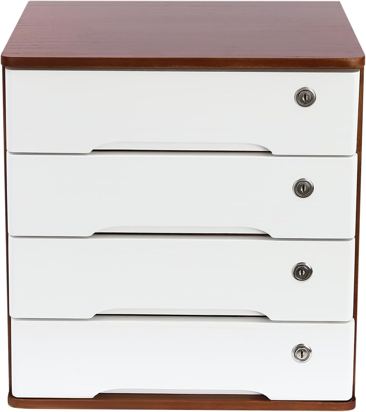 DescriptionDo you feel annoyed by too many items on your desktop that are cluttered and unorganized? Our 4-tier storage cabinet can help you solve this problem. This product is made of high-quality material, which ensures a long service life. The 4 drawers are convenient for you to organize different daily items, and the locking design effectively protects your privacy. It can effectively help you reduce the pressure on your countertop, which is an ideal choice for you.DetailsComfortable Handles: Each drawer has an ergonomic handle that is not only comfortable but also easy for you to pull the drawer.Smooth Edge: The rounded and smooth edges not only add to the aesthetics of the product but also improve the safety of use.Anti-slip Pad: It can keep the product stable and less likely to slip off while you use it.ApplicationThis product can be used in an office, study, bedroom, dresser, kitchen, etc. It is suitable for organizing documents, files, pens, notebooks, handy stickers, remote controls, staplers, cosmetics, greeting cards, tickets, business cards, stationery, jewelry, hair accessories, and so on.SpecificationColor: Wood Color + WhiteShape: RectangleStyle: ModernMaterial: Tung WoodProcess: Spray Paint Assembly Required: NoNumber of Tiers: 4Number of Locks: 4Number of Keys: 8Max. Load Capacity: About 30kg/ 66.14 lbsGross Weight: 6kg/ 13.23 lbs Package Size: 45.5*45*33 cm/ 17.91*17.72*12.99 inProduct Size: 40*28*40.5 cm/ 15.75*11.02*15.94 inPackage Included1* 4-Tier Storage Cabinet8* Keys4* Anti-slip Pads