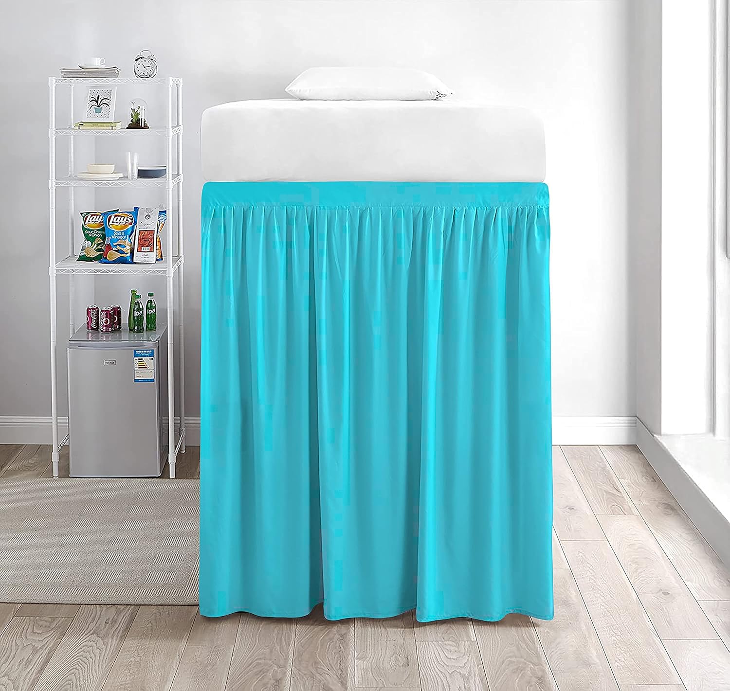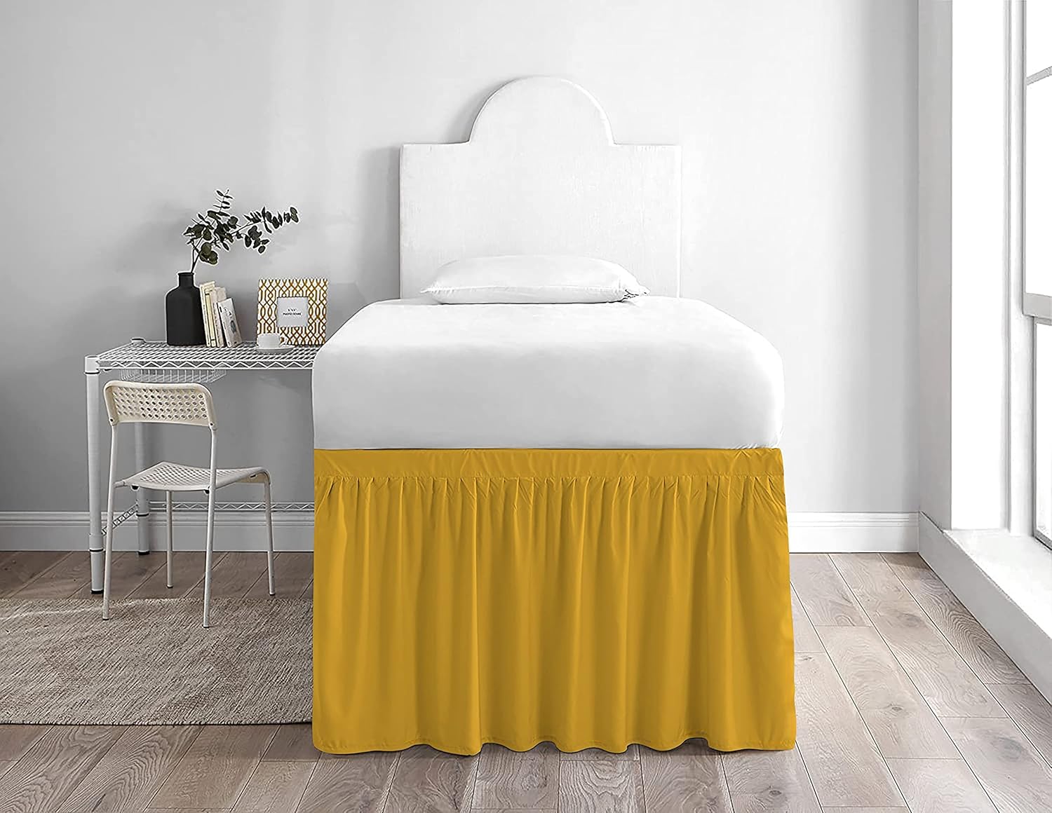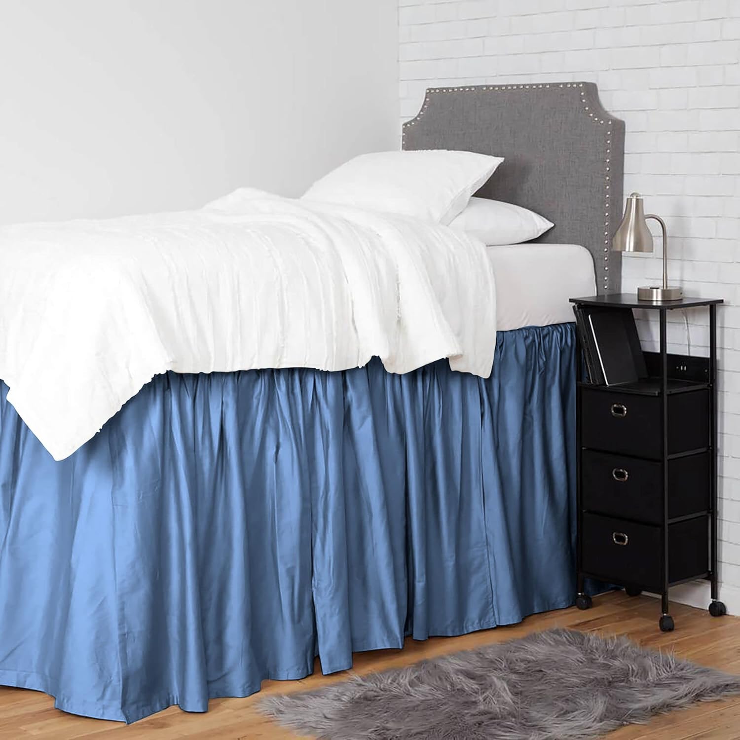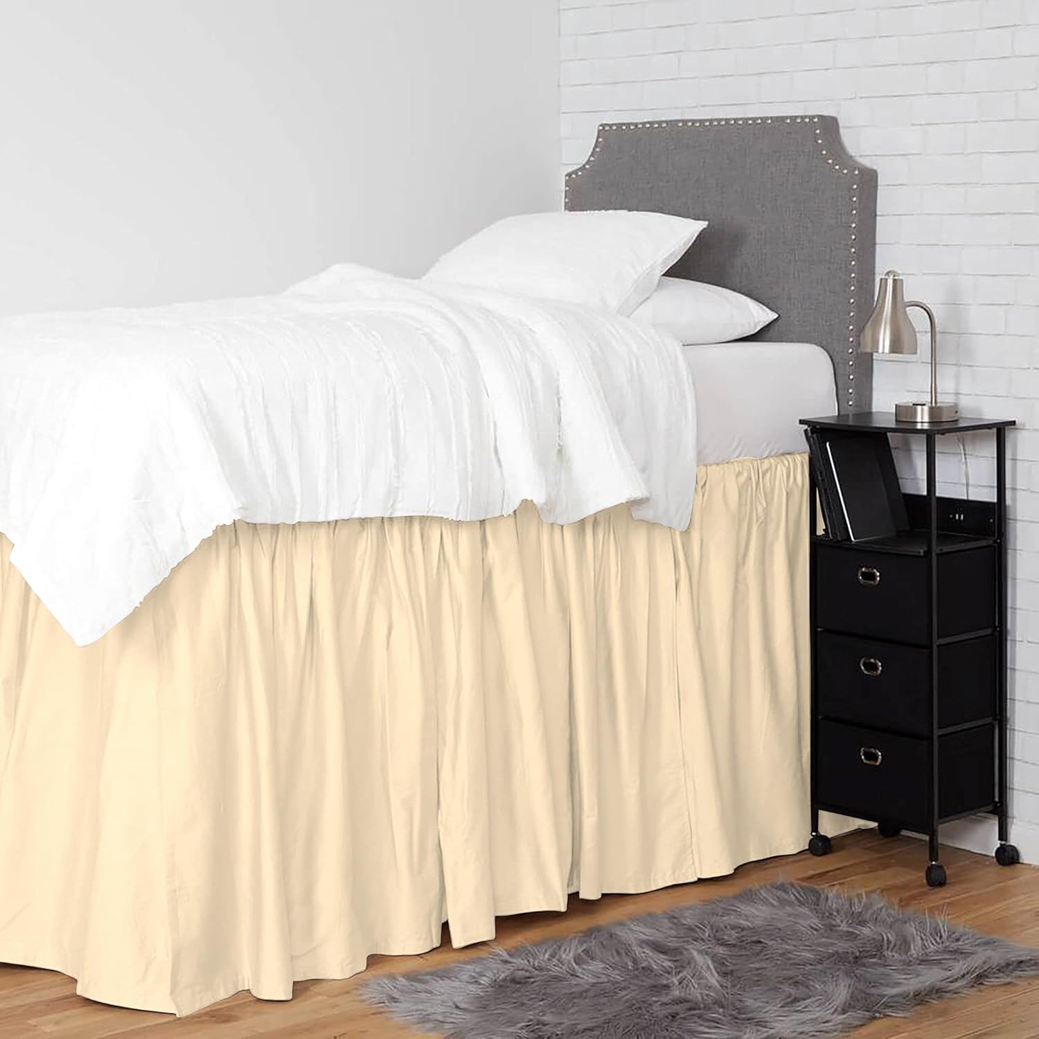 Product Description1 Piece Dorm Bed Skirt.3 Sided Panels.Delightful ruffled design features gathered ruffles around 3 sides of the bed for a classic, beautiful look. This Ruffle gathered Dorm Bed skirt is having a pretty appearance. It will hang nicely & helps to hide the space below the bed.Give your bedroom a sleek look with this classic Bed Skirt. 600 thread count 100% Cotton Sateen fabric skirt is not only soft, comfortable, and breathable but also gives a royal look to your bedroom. Match it with the choice of your cotton sheets to give your bed's hotel-like look.