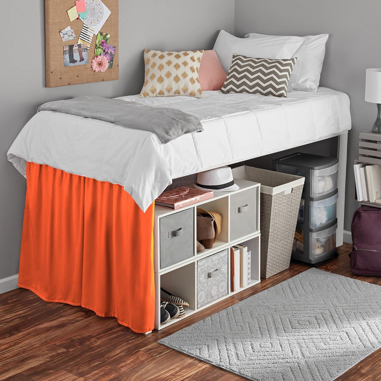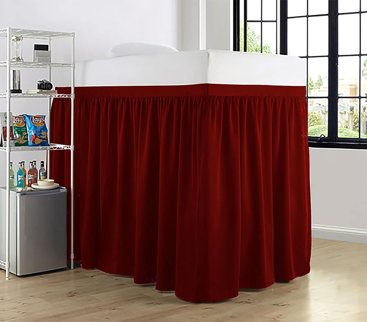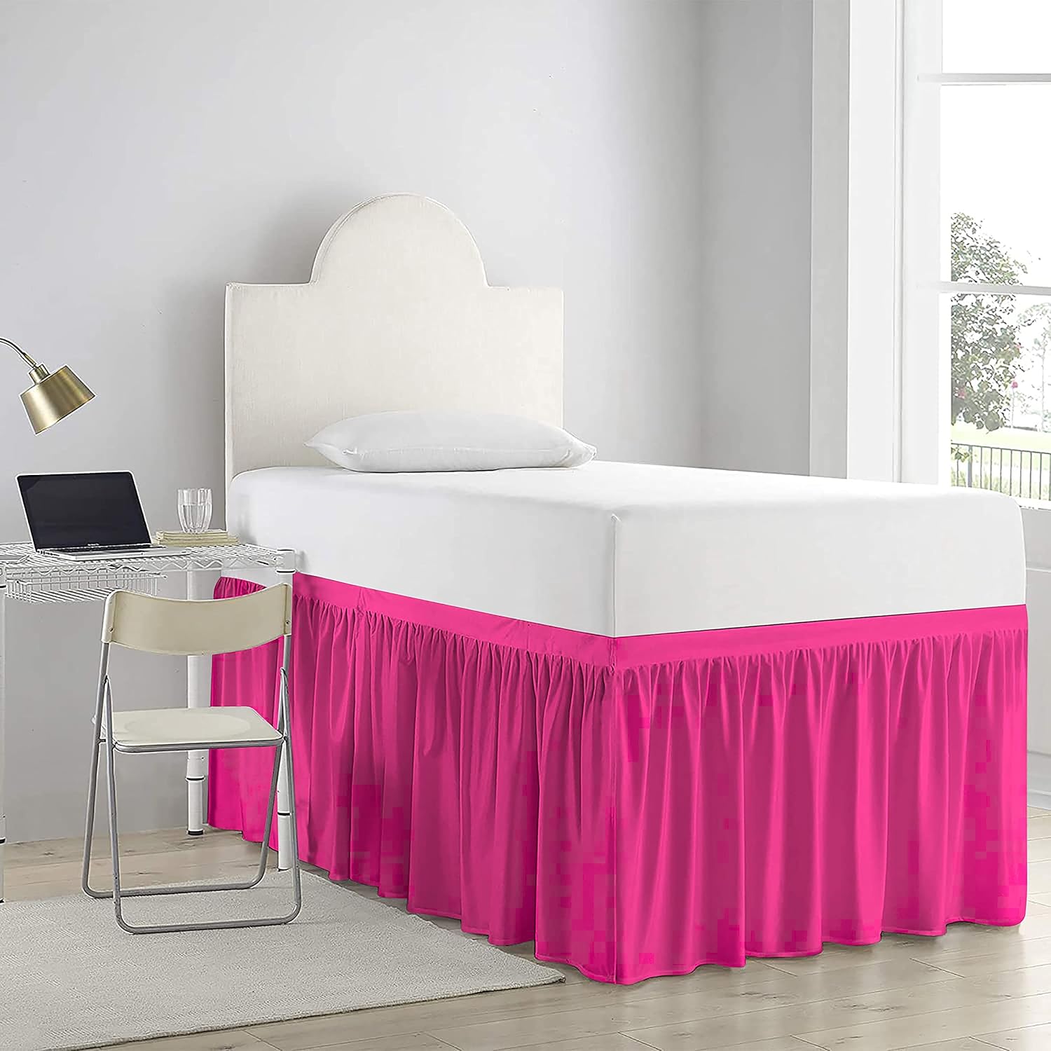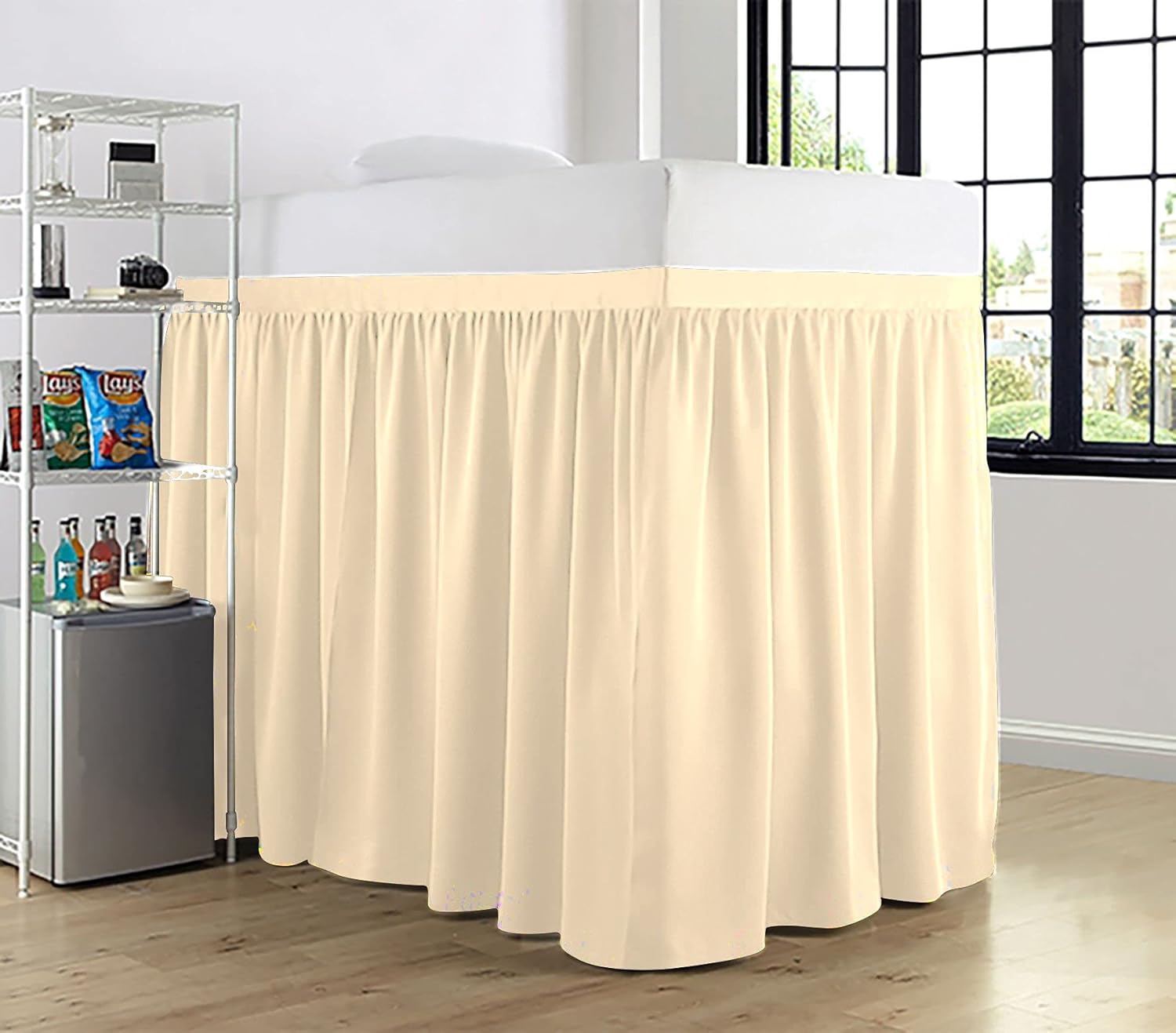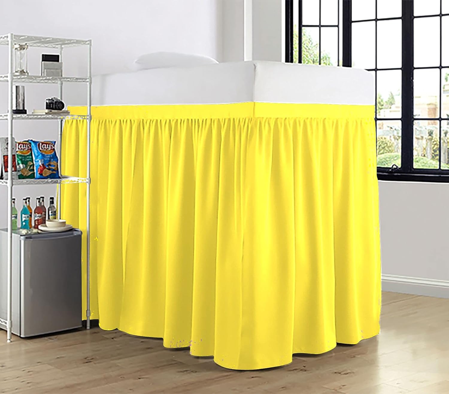 Product Description1 Piece Dorm Bed Skirt.3 Sided Panels.Delightful ruffled design features gathered ruffles around 3 sides of the bed for a classic, beautiful look. This Ruffle gathered Dorm Bed skirt is having a pretty appearance. It will hang nicely & helps to hide the space below the bed.Give your bedroom a sleek look with this classic Bed Skirt. 600 thread count 100% Cotton Sateen fabric skirt is not only soft, comfortable, and breathable but also gives a royal look to your bedroom. Match it with the choice of your cotton sheets to give your bed's hotel-like look.