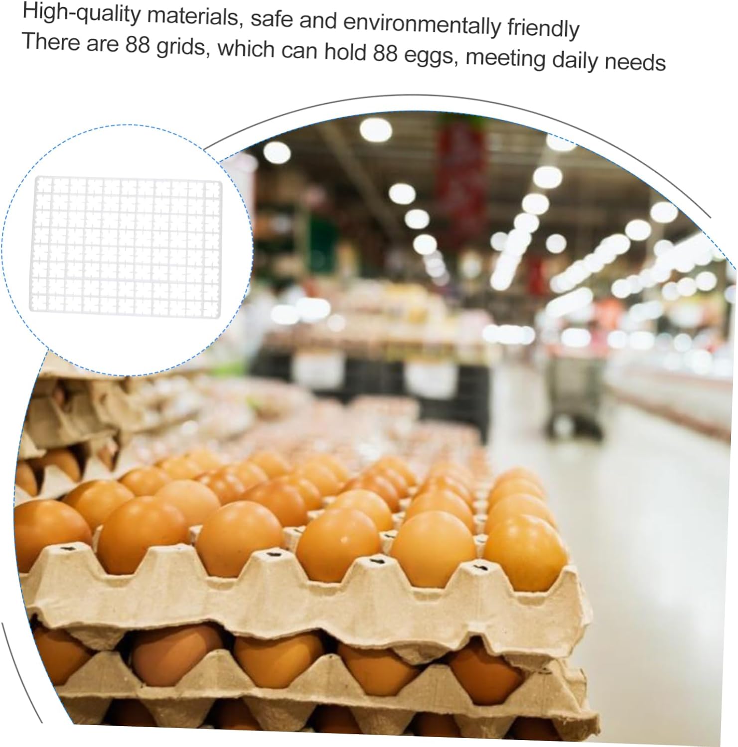 Package Include 1 x egg holder Features - Color: White 88 Grids Egg Storage Tray. - Material: Plastic Household Egg Trays. - Size: About49.50X36.00X3.50cm/ 19.45X14.15X1.38inch Egg Storage Container. - Large grid design, whether it is eggs, eggs, preserved eggs can be easily stored Egg Tray. - Plastic material is strong and does not change color for a long time Reliable Egg Holder. - It allows 88 piece eggs to put in at once, greatly hatching efficiency Egg Storage Trays. - Durable and sturdy, provide well protection for egg, and will not bring harm to egg Egg Fixing Holder. - Reasonable avoid the eggs fragile accidentally Protective Egg Holder.Goods DescriptionReliable Egg Holder Are you still worried about your eggs being easily broken? If so, our egg holder is carefully prepared for you.88 Grids Egg Storage Tray Made of plastic material, it is and durable.Egg Incubator Tray Let your eggs be arranged in orderly, safe and orderly manner