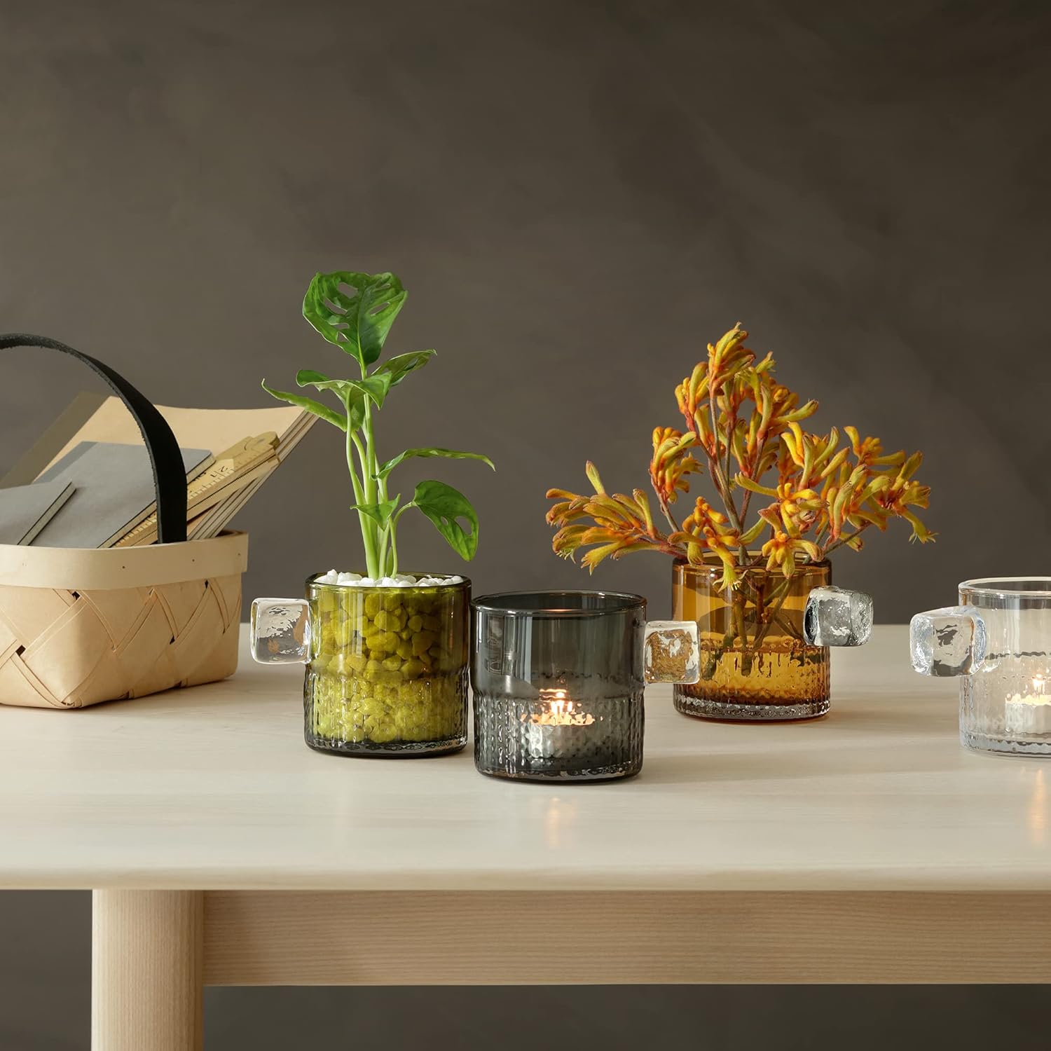 Designed primarily as a tealight holder, this mouth-blown glass vessel may also be used as a vase, pencil pot or planter. Supplied with tealight candle.
