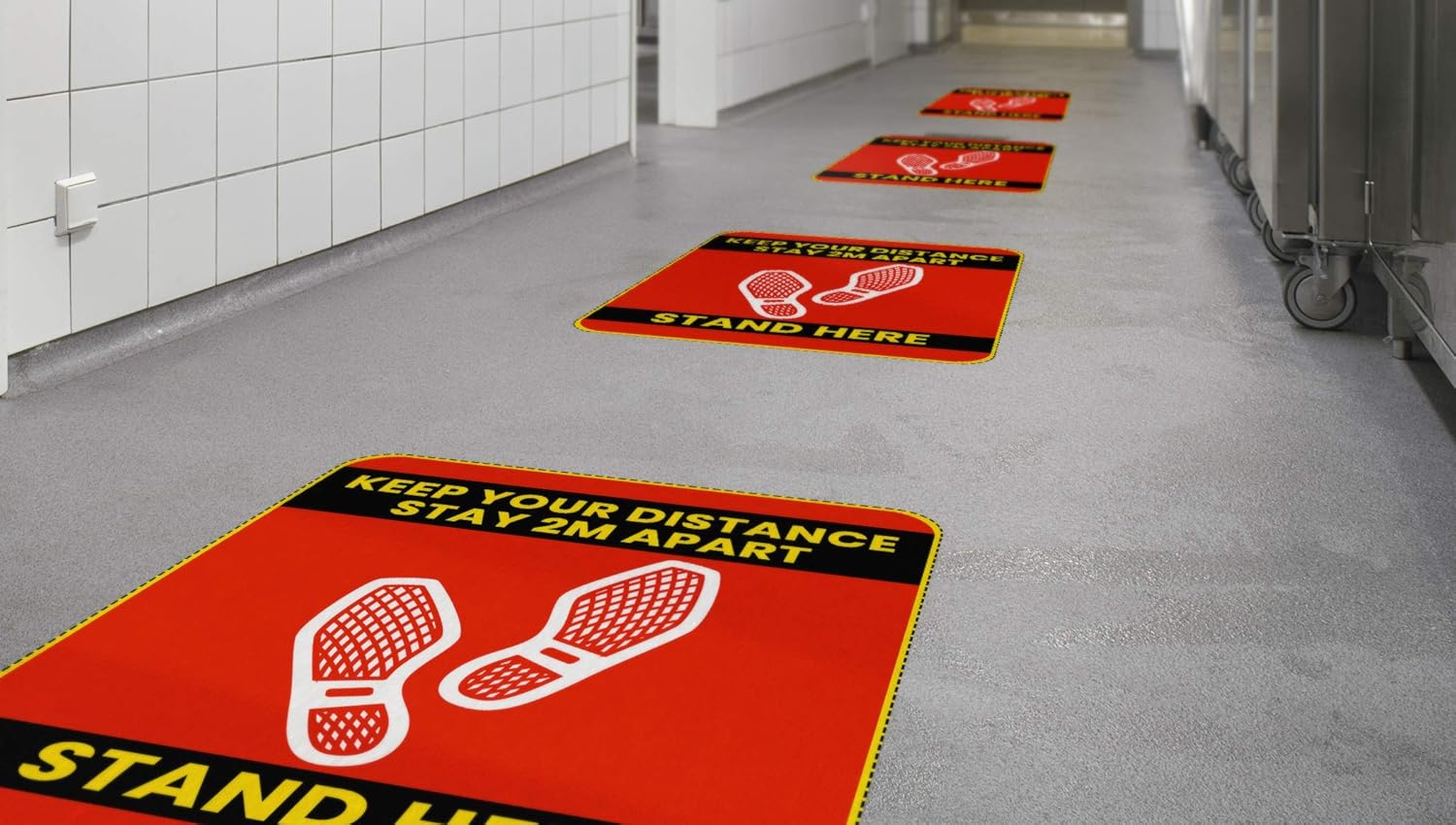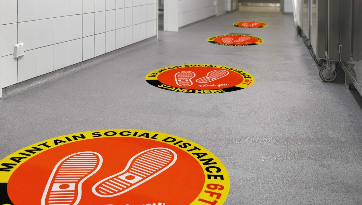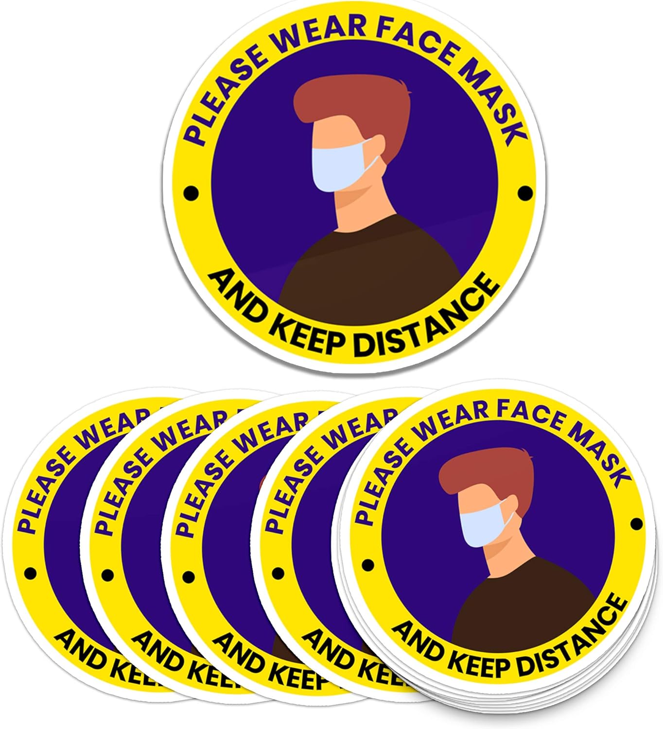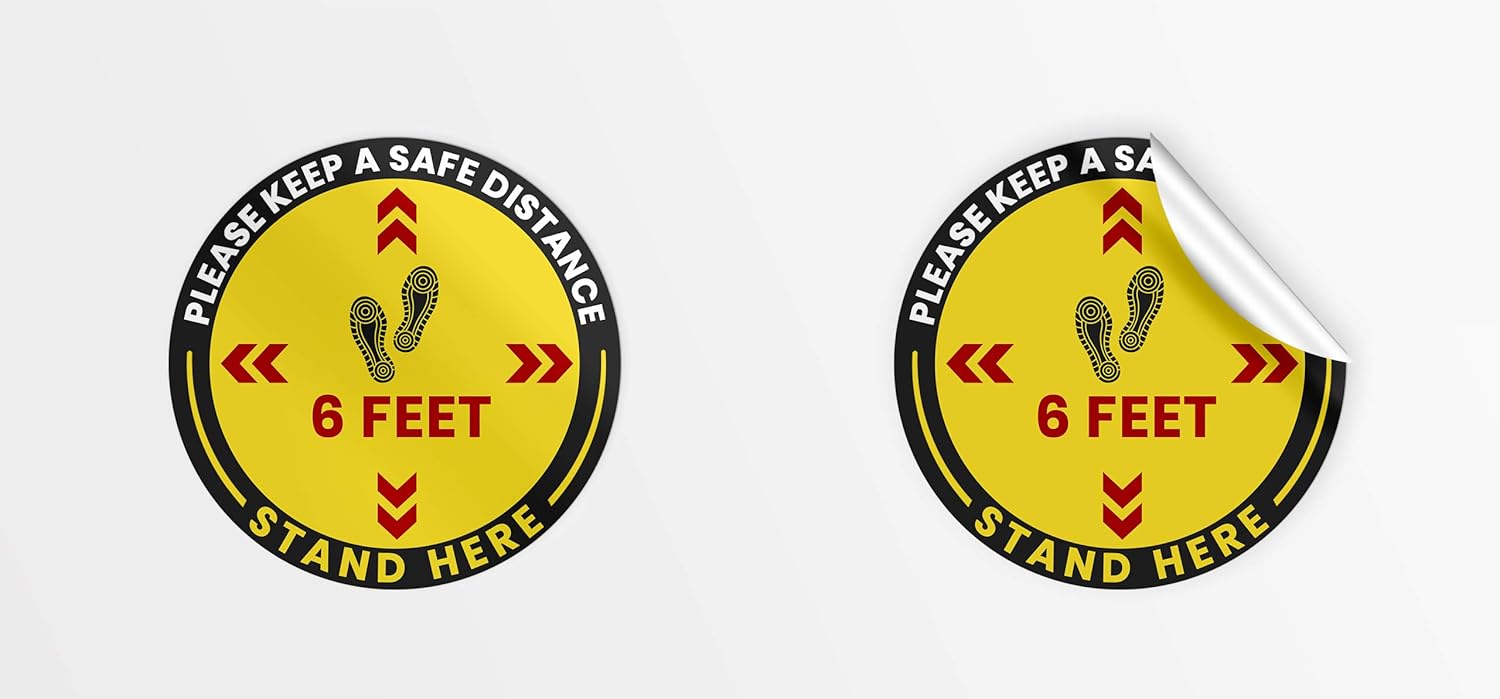 ✅ — NON-SLIP TEXTURED PVC MATERIAL: This PVC has a post-printed anti-slip rating of R10, according to DIN 51130:2010, which allows for vibrant, slip-resistant floor graphics. If they get any creases during installation, you can simply heat up the area with a heat gun or hair dryer and press the wrinkle out.✅ — PRESSURE SENSITIVE: Made of 200μ White Matte Monomeric PVC - It’s an embossed printable white matte film that is coated on one side with a dotted-pattern and removable pressure sensitive Acrylate polymer adhesive.✅ MADE IN THE USA: — Created in our manufacturing facility located in the USA. These floor decals were designed for grocery stores, Dr. Offices, Hospitals and anywhere else that a crowd of people gathers. Can be re-applied and re-positioned over and over again without issue of losing it’s patented adhesive backing. ✅ — DURABLE & WATERPROOF: Our social distancing floor decal stickers are slip resistant and scuff resistant. They are suitable for any floor, you can removable or re-locate at anytime. ✅ — IDEAL FOR HIGH FOOT-TRAFFIC AREAS: This floor decal is perfect for crowd control guidance, pharmacy, bank, lab, grocery stores, Dr. offices, hospitals, malls and anywhere else that a line of people gathering. Our bright & durable floor decal to help everyone practice social distancing.✅ — COMMERCIAL USE: Commercial Social Distancing Floor Stickers help keep your customers and employees safe with these social distancing floor signs.✅ — CUSTOM DESIGNS ARE WELCOME! You guessed it, we can customize these to fit your branding needs. Whether you have your very own wording or logo needed, we are here to help deliver a customized product you desire in any design or size!