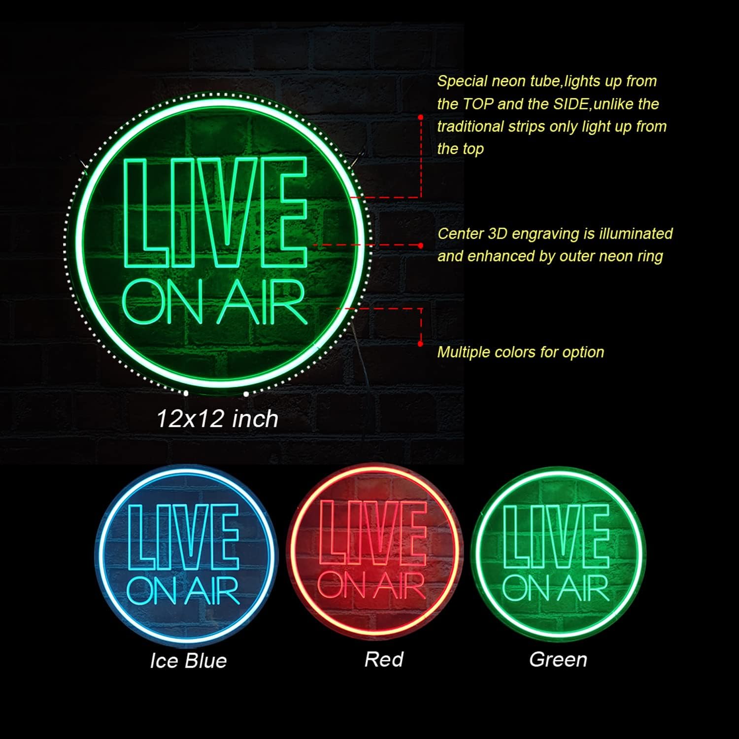 NOXTROND Neon Live On Air Light Sign, USB Powered On Air Led Light Up Sign, Dimmable Wall Décor Round On Air Streaming Neon Sign for Streamer, Gamer, Game Room, Studio Decor (Warm White-Live On Air) Features: This live on air neon sign is 12inch diameter size. The neon on air led sign is blue light, it is bright but not glaring. This live on air neon light signs is dimmable, you can adjust the brightness and turn on/off the neon sign easily via the dimmer switch. This live on air light sign is powered by 5V input USB cable, it is extremely safe. What in the box: 1* LIVE Neon sign light 1* transparent hanging line 1* 4 fixing screws 1* 2 wood stands 1* user manual