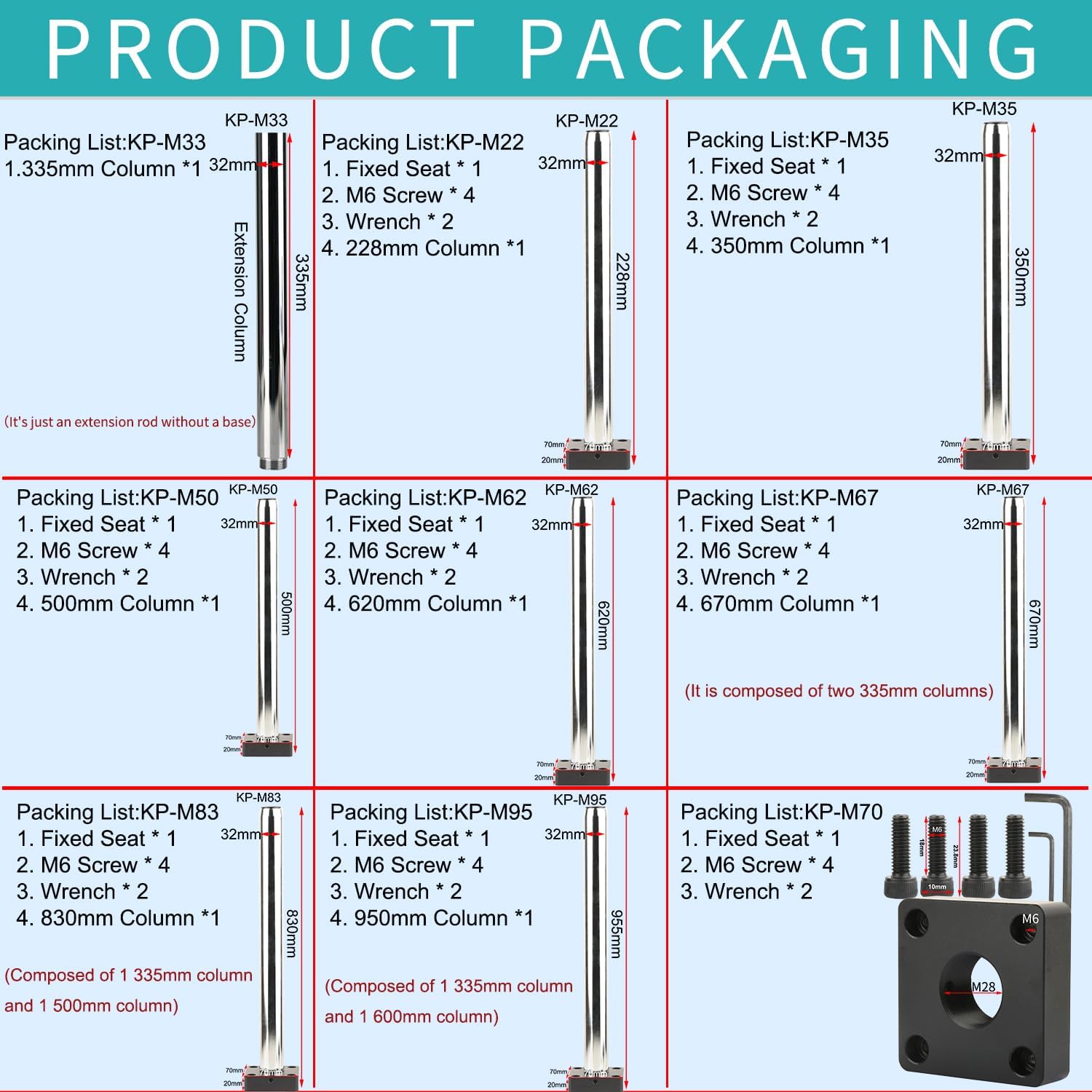 Model KP-M33 KP-M22 KP-M35 KP-M50 KP-M62 KP-M67 KP-M83 KP-M95 Column Length 335mm 228mm 350mm 500mm 620mm 670mm 830mm 950mm Column Diameter 32mm 32mm Locating Hole Diameter 6mm 6mm Locating Hole Distance 50mm 50mm Column Aperture Diameter 27.8mm 27.8mm Fixed Seat Size Not included 70mmX70mmX20mm