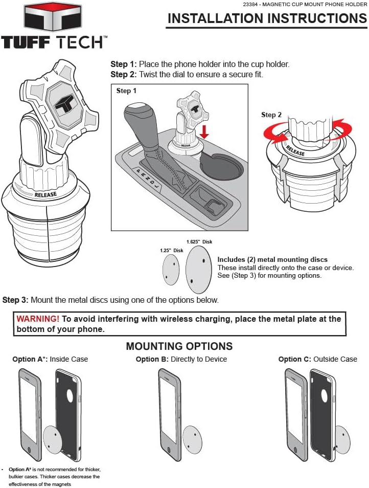 The Tuff Tech Cradle Cup Mount Phone Holder keeps your phone in place whether you're on smooth roads or hard terrain. Durably built to join you on your adventures, this phone holder is designed with a 360-degree rotating head that allows easy, adjustable viewing both horizontally and vertically. It also features a mechanical cradling system with padded arms that grip smartphones from 1-1/2" to 3-3/4" wide, keeping them secure. A quick-release button on the side opens the holder so you can take your phone with you. An articulating arm pivots up and down, ensuring your device is always positioned at the optimal viewing angle. An adjustable dial controls the diameter of the base creating a snug, custom fit inside most cup holders. Simply twist it counterclockwise to make it expand or twist it clockwise to make it contract. For maximum visibility and hands-free access to your phone or GPS, you can't beat the Tuff Tech Cradle Cup Mount Phone Holder.